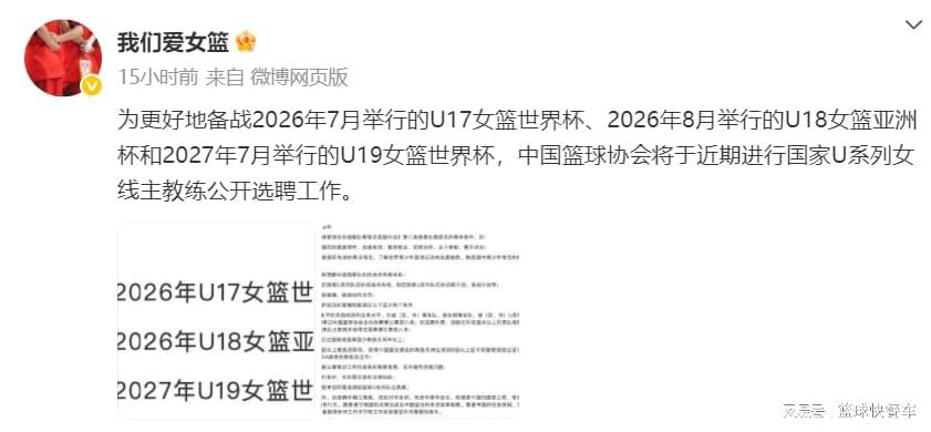 在接下来的一两年内,U系列青年队将面临多项国家队大赛的挑战,包括2026年7月的U17世青赛、同年晚些时候的U18亚青赛,以及2027年7月的U19世青赛。目前,这三项赛事的主教练人选尚未确定,但与以往篮协直接任命不同,这一次将通过公开选拔,择优录取。这意味着,只要有能力,任何教练都有机会执掌女篮帅印,为中国女篮的未来贡献力量。