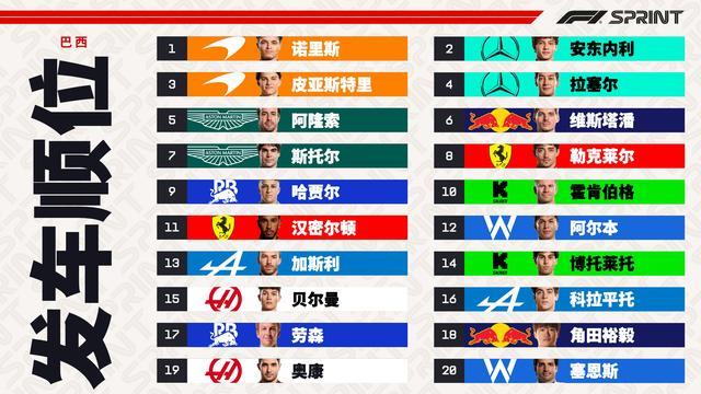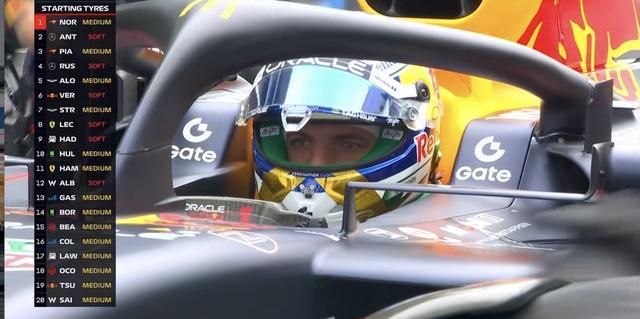 在起步顺位上,诺里斯和安东内利包揽了前排发车位,展现出强大的竞争力。身后的则是皮亚斯特里和拉塞尔,他们同样对领奖台虎视眈眈。阿隆索和维斯塔潘则处在第三排,角田和塞恩斯则从维修区起步,为比赛增添了更多不确定性。