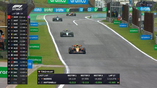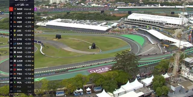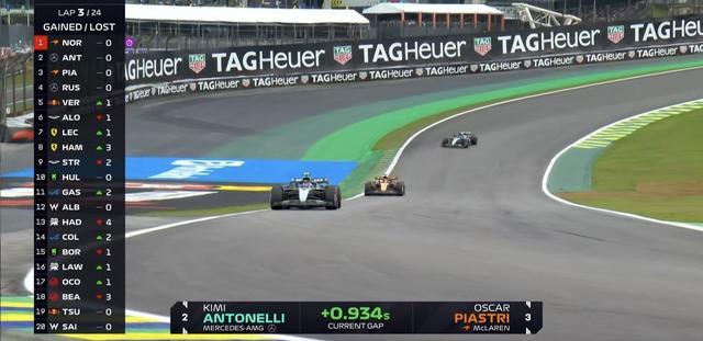 第18圈,安东内利逐渐追近领跑的诺里斯,而阿隆索则被维斯塔潘带开6秒差距,斯特罗尔也掉出了DRS区间。