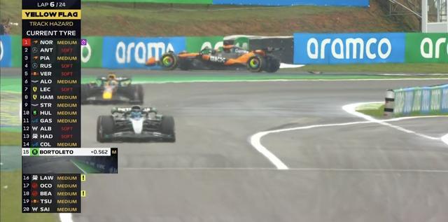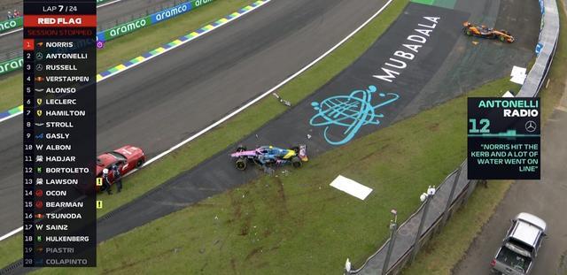 安东内利在赛后表示,诺里斯在比赛中使用了更多的路肩,导致大量的积水被带到赛车线上,这也间接导致了三位车手的失控退赛。