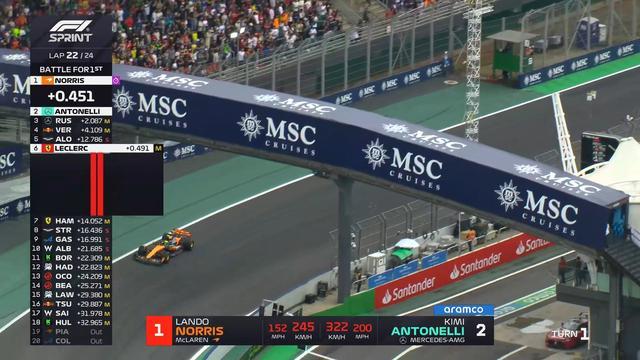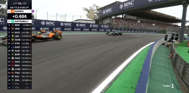 第21圈,诺里斯的软胎开始出现挣扎,安东内利趁机追近至诺里斯身后仅0.48秒,比赛悬念再起。