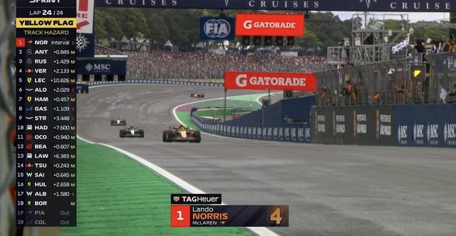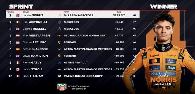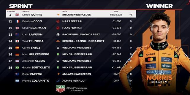 最终冲线时刻到来!诺里斯在冲刺赛中完成pole to win的壮举,与队友在积分榜上的差距扩大至9分,为接下来的比赛奠定了坚实基础。
