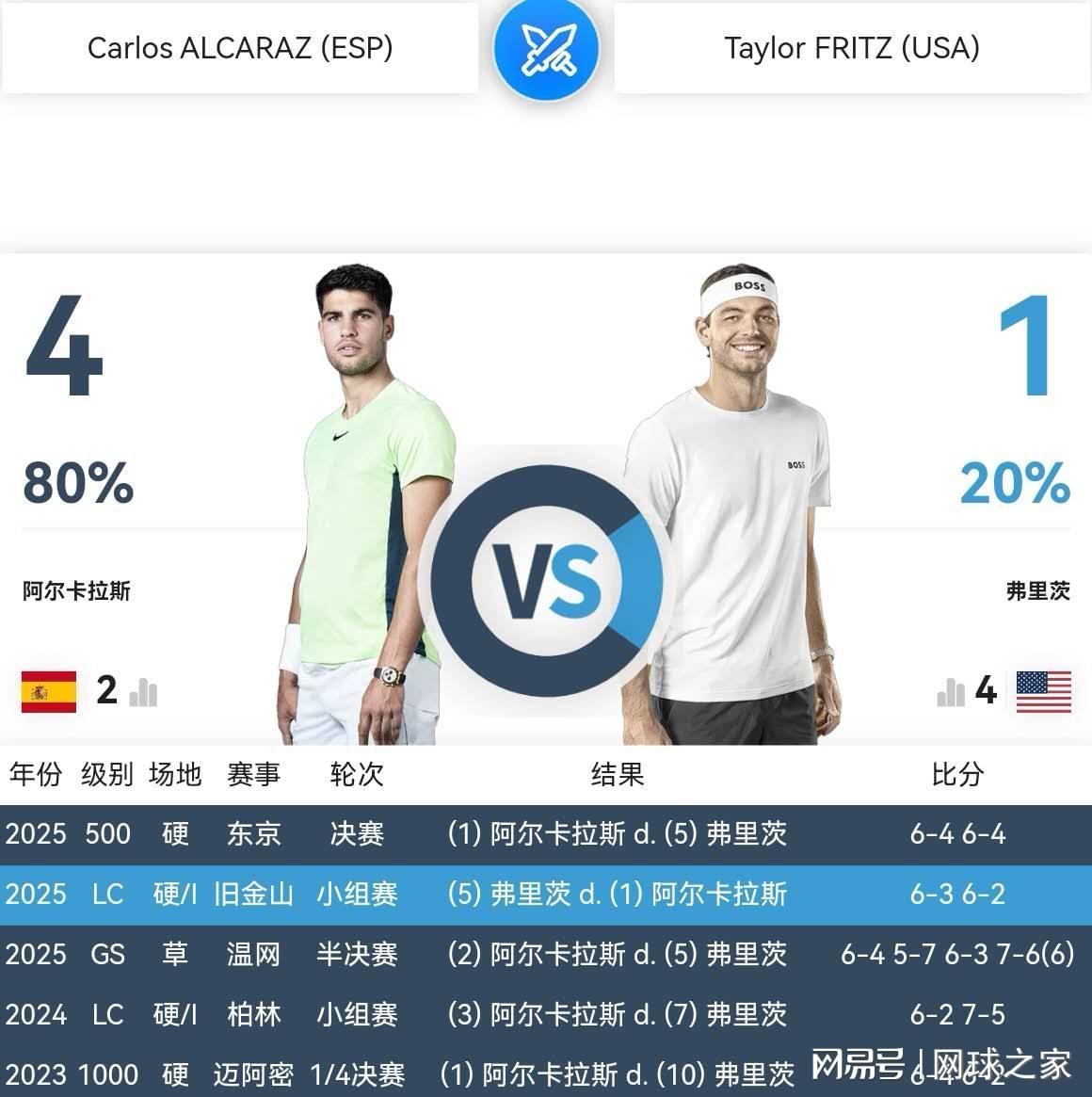 美国选手弗里茨的硬地作战能力尤为突出。两人职业生涯交锋五次,阿尔卡拉斯以四胜一负大幅领先。本赛季,阿尔卡拉斯在温网半决赛3:1击败弗里茨,后者赛后直言“宁愿对阵辛纳也不想碰到阿尔卡拉斯”。然而,在拉沃尔杯表演赛中,弗里茨两盘横扫阿尔卡拉斯,为队伍夺冠立下大功;但紧接着的ATP500东京站决赛,带伤作战的阿尔卡拉斯却以两盘完胜弗里茨,令对手陷入困境。