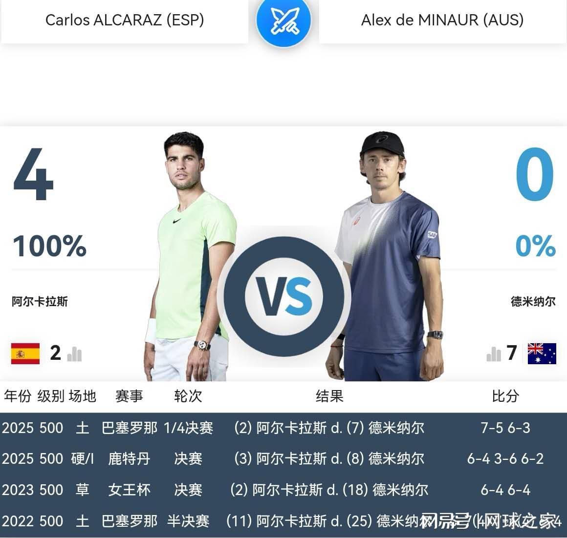 澳大利亚选手德-米纳尔首次闯入ATP年终总决赛,但面对阿尔卡拉斯时,他的晋级之路显得尤为艰难。两人职业生涯交锋四次,德-米纳尔无一胜绩。本赛季,阿尔卡拉斯在ATP500鹿特丹站决赛2:1击败德-米纳尔,夺得个人首个室内硬地冠军;随后在ATP500巴塞罗那站1/4决赛中,阿尔卡拉斯两盘横扫对手,将交锋记录改写为四胜零负。