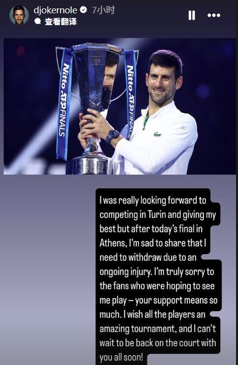 德约科维奇在社交媒体上发布了一段真挚的声明,他表示:“我真的希望能以一个最好的状态去都灵参加年终总决赛,但在今天雅典的比赛后,我很遗憾地宣布我将因伤退赛。对于想来看我比赛的粉丝们,我感到非常抱歉,你们的支持对我来说意味着一切。我希望所有参赛者可以打出一站精彩的比赛,同时我也期待着尽快重返赛场!”这段话透露出德约对球迷的深厚情感以及对未来重返赛场的渴望。
