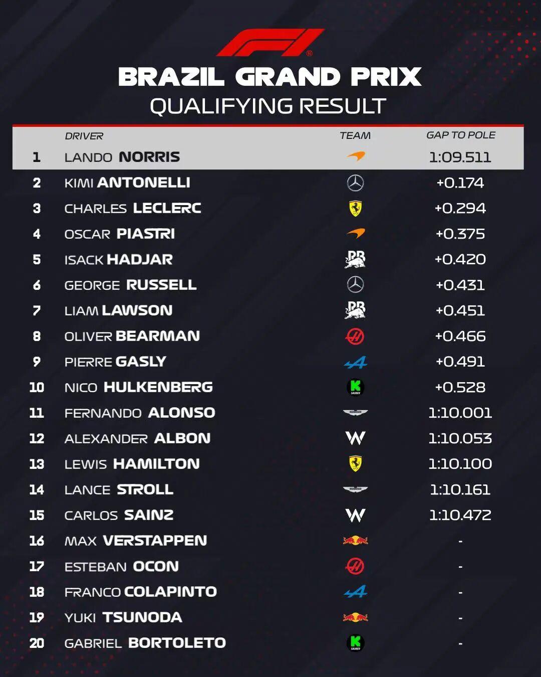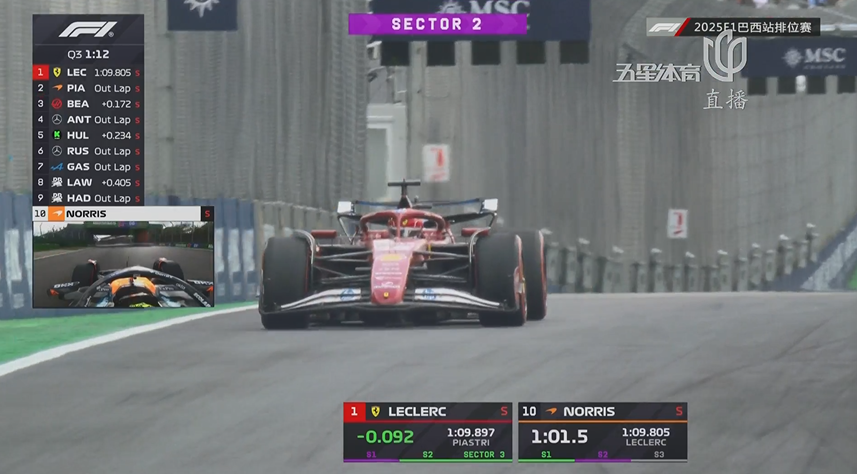 杆位争夺战中,皮亚斯特里虽率先刷紫,但勒克莱尔凭借两个计时段的微弱优势反超。然而诺里斯展现出统治级表现,以1:09.511锁定杆位。安东内利异军突起,第二、第三计时段分别刷紫,最终以1:09.685力压勒克莱尔获得第二,正赛将从第一排发车。