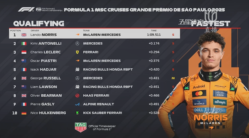 北京时间11月9日凌晨,2025赛季F1巴西大奖赛排位赛在英特拉格斯赛道展开激烈争夺。本站比赛迎来戏剧性转折——迈凯伦车手诺里斯延续周末强势表现,以1:09.511的成绩夺得杆位,安东内利以0.174秒之差位列第二,勒克莱尔排名第三。红牛车手维斯塔潘却在Q1阶段因赛车抓地力异常提前出局,仅获得第16名无缘后续争夺,这一结果令年度车手冠军争夺战悬念陡增。