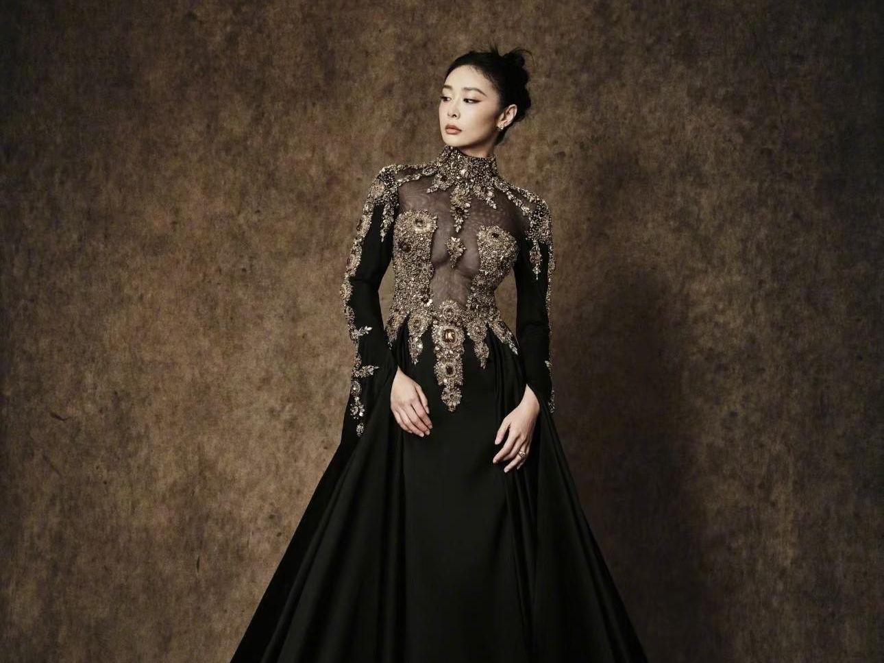 这套阿玛尼高定礼服堪称设计典范:以黑色透视网纱为基底,巧妙点缀细碎金色钉珠与水晶,在灯光下折射出璀璨光泽。高领复古剪裁与长袖设计,与透视面料形成精妙平衡——既保持了优雅的底线,又大胆释放了女性魅力。高叶168cm的身高搭配匀称紧致的身材线条,将这套造型的精髓演绎得淋漓尽致:腰臀曲线在透视面料下若隐若现,肩颈利落线条中和柔美气质,刚柔并济的呈现方式,哪里是“撑不住”,分明是精准驾驭时尚的典范。