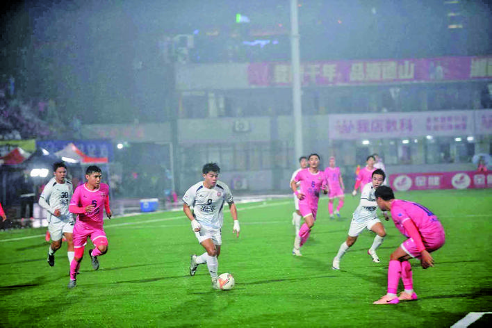 湘潭队雨中积极拼抢带球。(记者 罗韬 摄)