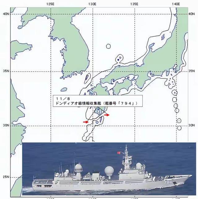 11月10号,也就是我国外交单位公开抗议日本首相高市早苗涉台言论的当天,日本所谓的统合幕僚监部对外发布了一则消息,声称11月8号凌晨1点左右,他们的海上自卫队在鹿儿岛县以西大约70公里的海域上发现了正在向该海域行驶的中国海军的一艘战舰。经过确认之后,发现这是一艘815型电子侦察船。