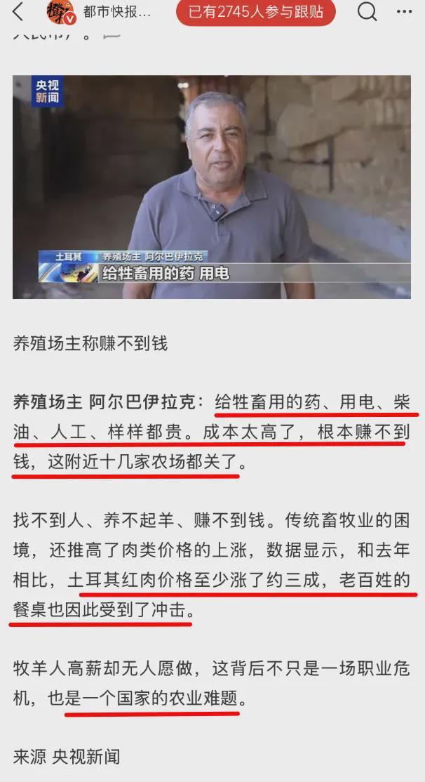 这是媒体发布的一条关于“土耳其”的畜牧现状,总台记者千里迢迢跑过去采访,得知“土耳其传统畜牧业的农场主们,正在承受极大的压力,月薪两三万招人去放羊,都招不到,导致当地肉价疯狂飙升等一系列问题。”