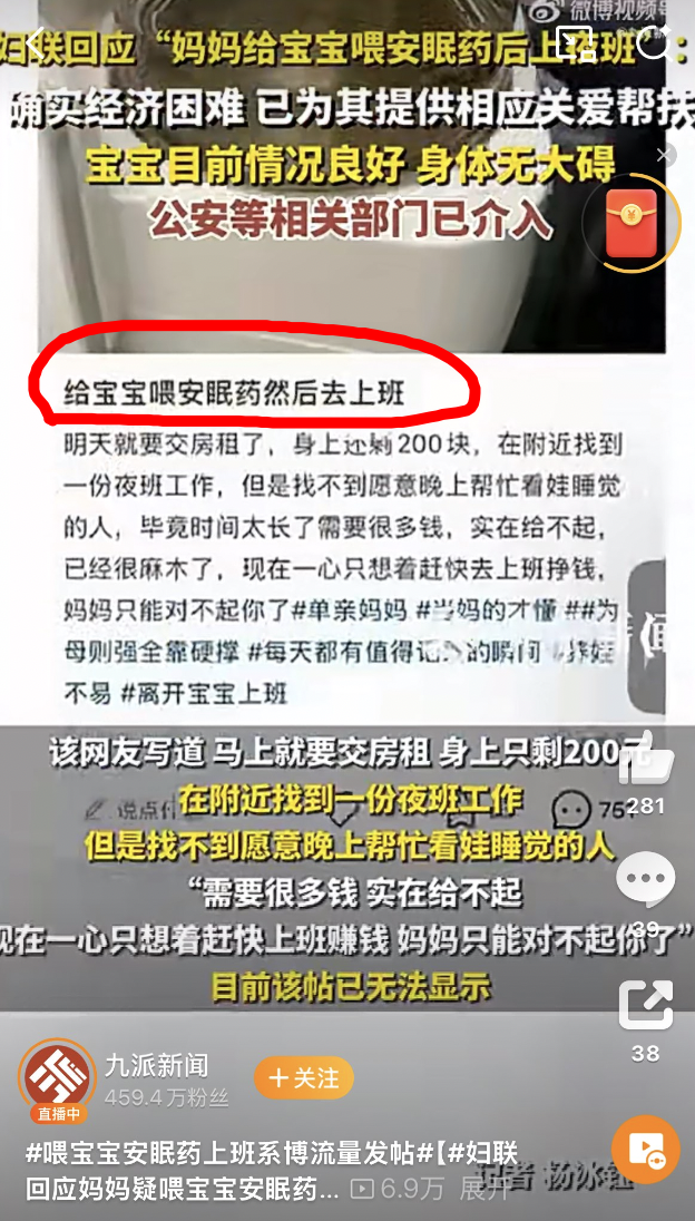 这是九派新闻今天发布的一条相当火的消息,一名母亲称,马上要交房租,身上只剩200块,在附近找到一份夜班工作,但是找不到愿意晚上帮看娃睡觉的人。于是只能给宝宝喂安眠药,然后去上班……