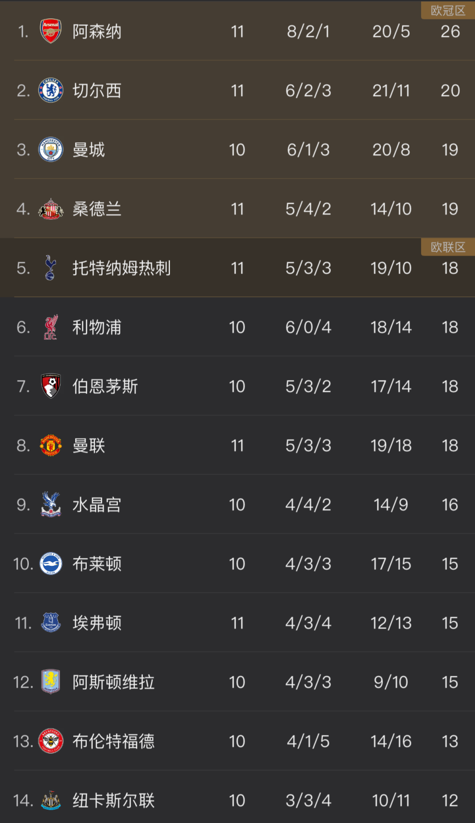 北京时间11月9日,2025-26赛季英超联赛第11轮展开激烈角逐,率先进行的5场比赛中,积分榜格局发生显著变化。领头羊阿森纳客场遭遇滑铁卢,切尔西强势升至次席,黑马桑德兰闯入前四,而曼联则暂列第8位。