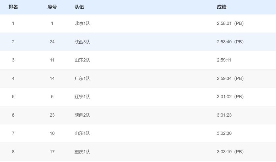 北京一队以2小时58分01秒的成绩刷新PB,成功夺得金牌。陕西三队以2小时58分40秒的成绩获得银牌,山东二队则以2小时59分11秒的成绩摘得铜牌。此外,由老将刘虹和王凯华组成的广东一队也表现出色,以2小时59分34秒的成绩刷新PB,获得了第四名的好成绩。