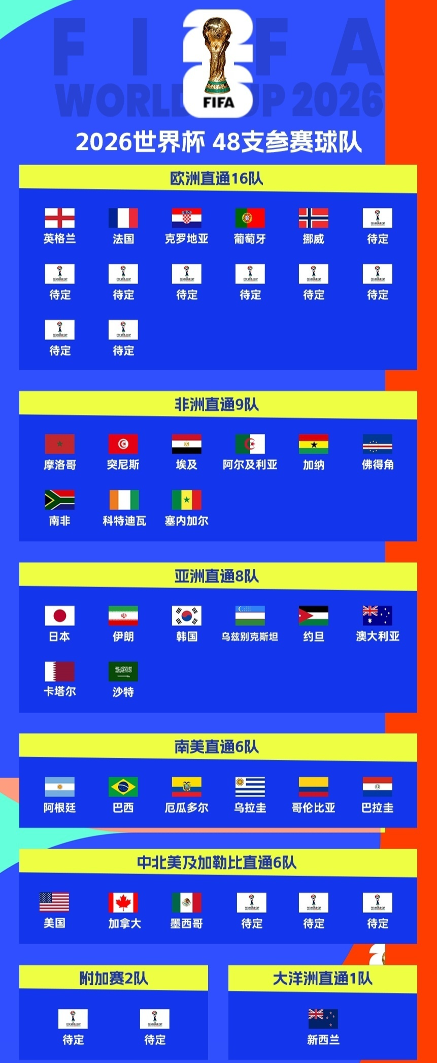 欧洲区(5席):英格兰、法国、克罗地亚、葡萄牙、挪威