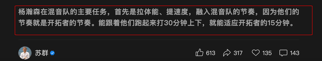 苏群老师进一步解释道:“杨瀚森在混音队的主要任务是拉体能、提速度,并融入球队的节奏。因为混音队的节奏就是开拓者队的节奏。只要他能够跟着球队跑起来打30分钟上下,那么他就能够适应开拓者队的15分钟比赛强度。”