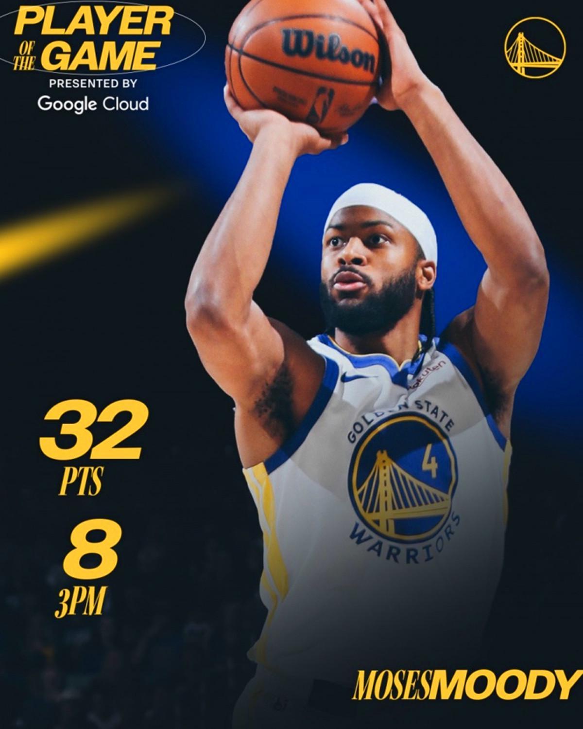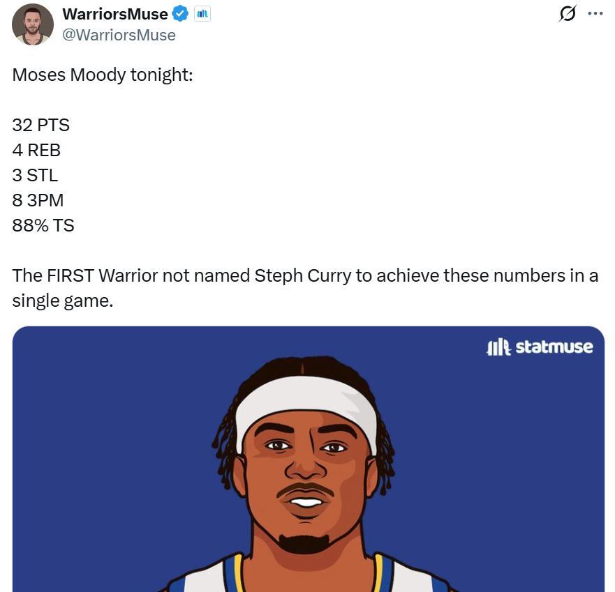 凭借这样的表现,穆迪成为库里之外,勇士队史第二位能够单场交出至少32分4篮板3抢断8记三分,且真实命中率88%的球员。