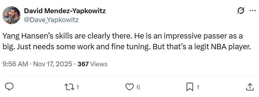 面对杨瀚森这样的表现,作为对手的湖人记者Dave Yapkowitz不禁发文称赞:“杨瀚森的技术功底有目共睹,作为一名大个子,他的传球能力让人印象深刻。只需要经历打磨,他绝对是NBA级别球员。”