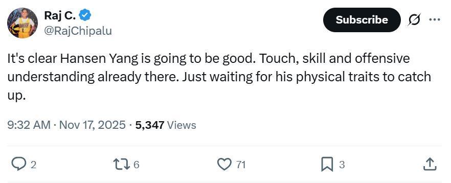 另外一位湖人记者Raj Chipalu也给出了相同的看法:“杨瀚森未来可期!他已经拥有出色的球感、技术与进攻意识,万事俱备,仅差身体素质了。”