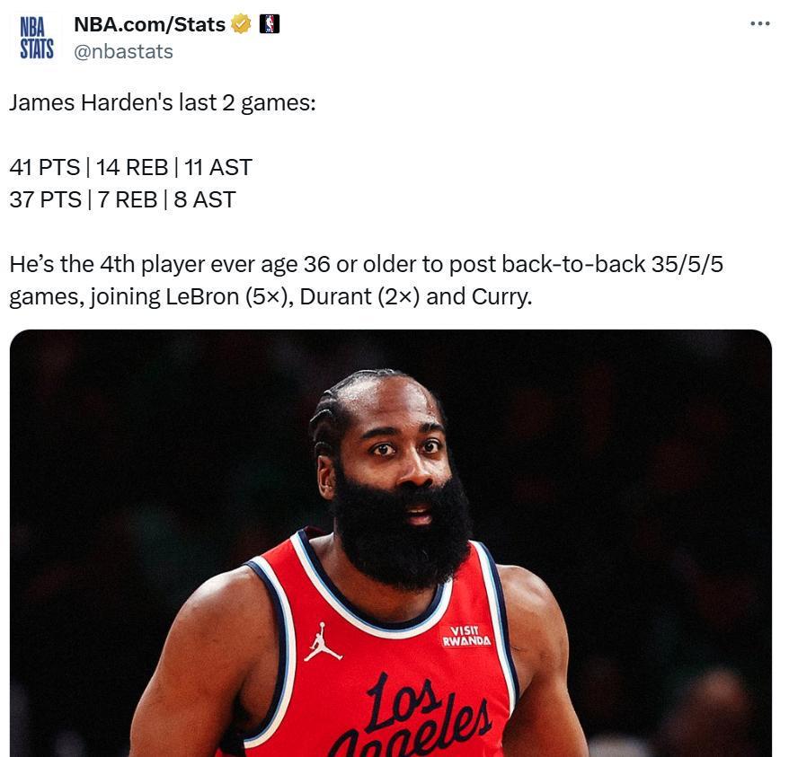 全场比赛,哈登空砍全场最高的37分,外加7篮板8助攻1抢断,成功打破纪录。他成为NBA历史上第4位在36岁之后,还能连续两场至少交出35分5篮板5助攻的球员,前三人分别是詹姆斯、杜兰特和库里。