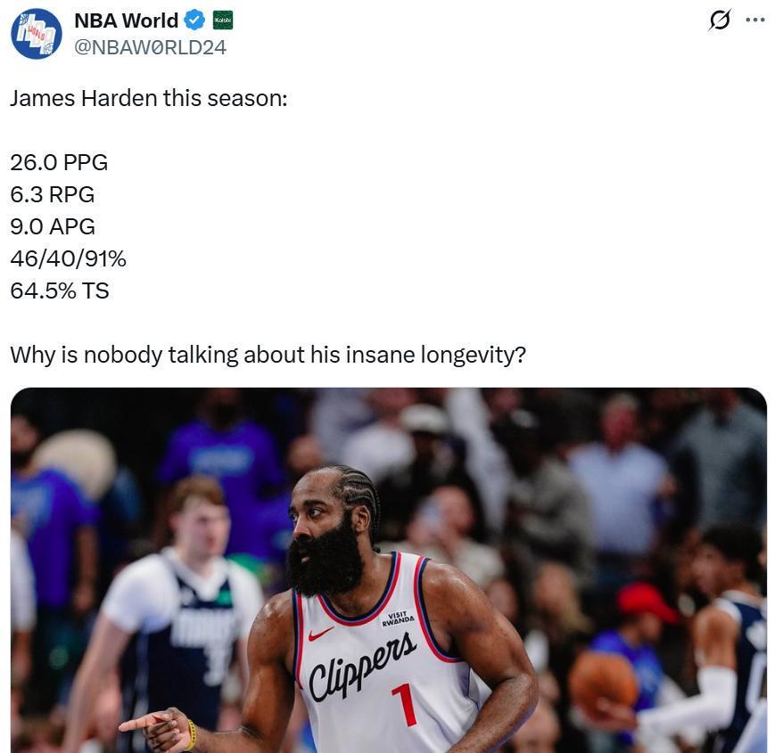 值得一提的是,在持续高产的同时,哈登还保持着88%的生涯出勤率,17个赛季已经出战1163场比赛。美媒NBA World不禁感叹:“为什么没人讨论他不可思议的职业生涯长度?”
