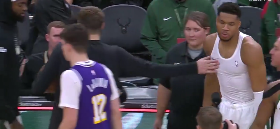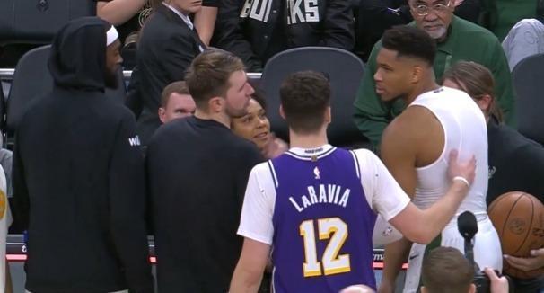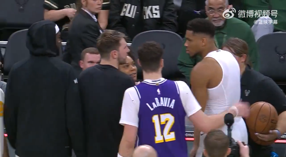 没想到,最后,还是字母哥看到了这一幕,他走过来一把把球拿过来,送给了东契奇。东契奇拿到了比赛用球,拍了拍字母哥的胸口表示感谢。