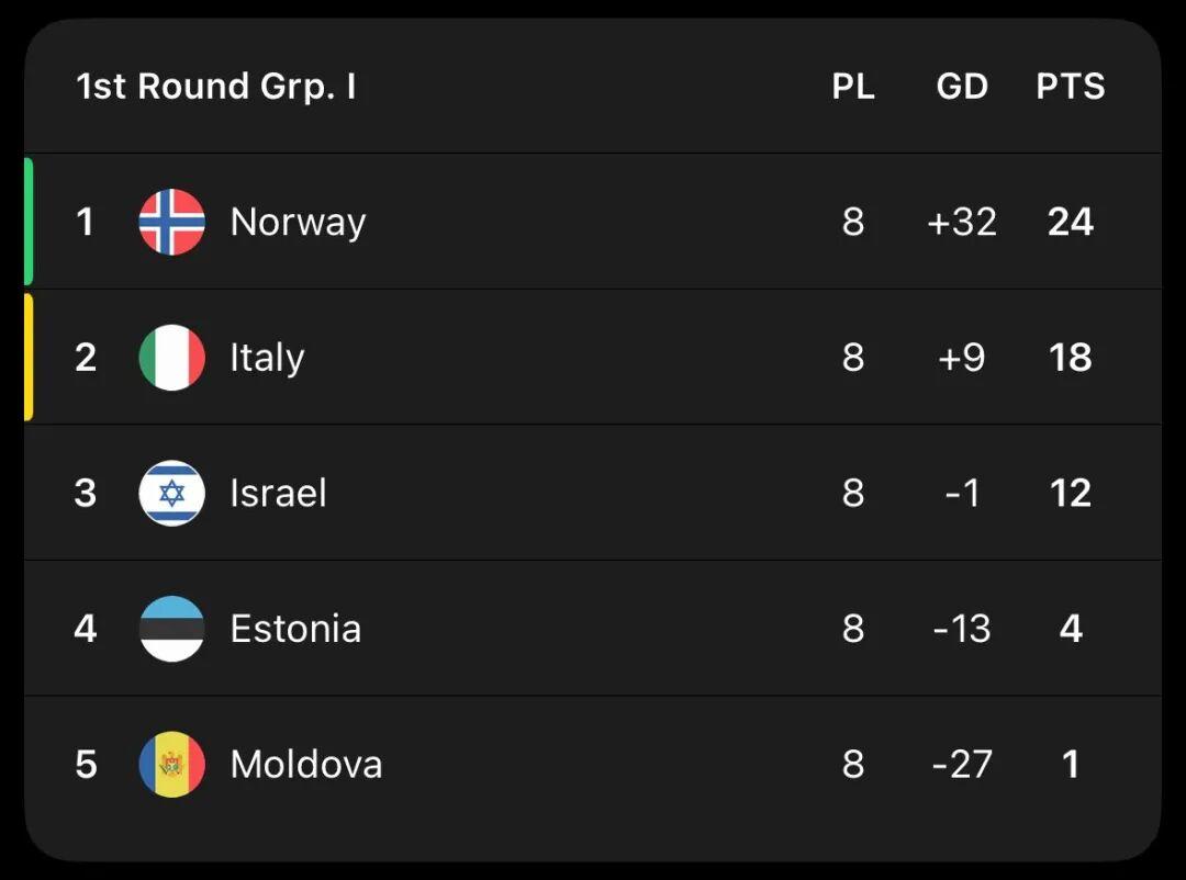本届预选赛I组汇聚意大利、挪威、以色列、爱沙尼亚和摩尔多瓦五支球队。尽管意大利作为2020欧洲杯冠军被视为出线热门,但由哈兰德(曼城)、厄德高(阿森纳)两大英超巨星领衔的挪威队迅速展现黑马本色。首回合主场3-0完胜意大利后,挪威队在后续比赛中持续碾压对手:面对小组最弱对手摩尔多瓦,两回合狂轰16球仅失1球,单是在该对手身上就斩获15个净胜球,为最终晋级奠定坚实基础。