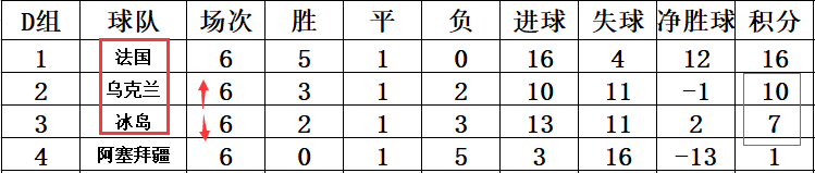 其他小组中,法国队5胜1平保持不败,以小组头名晋级;乌克兰2-0击败冰岛后反超对手,获得附加赛资格。F组的爱尔兰同样逆袭成功,他们先后战胜匈牙利和亚美尼亚,搭上附加赛末班车。英格兰队则以全胜战绩昂首出线,6场比赛0失球创造世预赛防守新纪录。