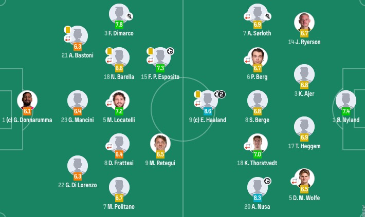 挪威首发:1-尼兰德、5-戴维-沃尔费(89'4-厄斯蒂高)、17-黑格姆、3-阿耶、14-瑞尔森、8-桑德-贝格、6-帕特里克-贝格(64'2-托斯比)、20-努萨、18-索尔茨维特(75'23-奥斯高)、7-瑟洛特(75'22-奥斯卡-鲍勃)、9-哈兰德(89'11-尤尔根-拉森)