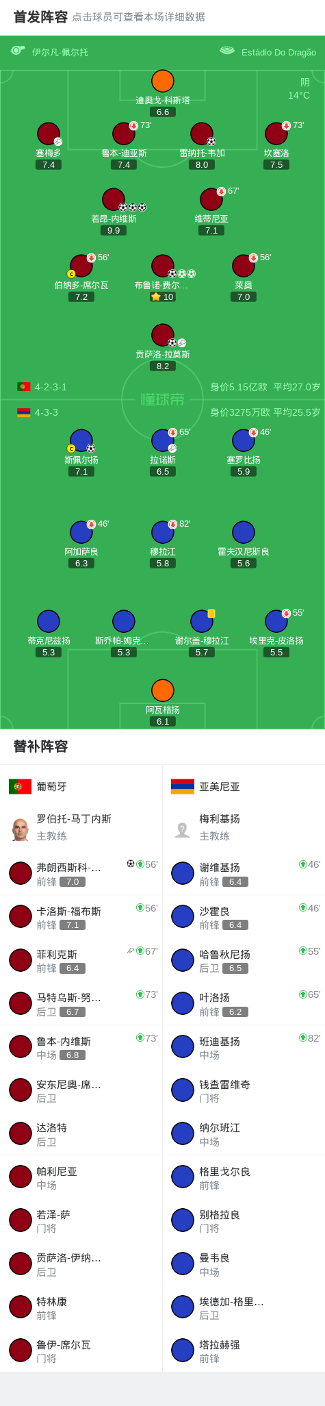 第7分钟,葡萄牙取得梦幻开局!B费主罚任意球被对方门将扑出,雷纳托-韦加机敏头球补门,葡萄牙1-0领先亚美尼亚。