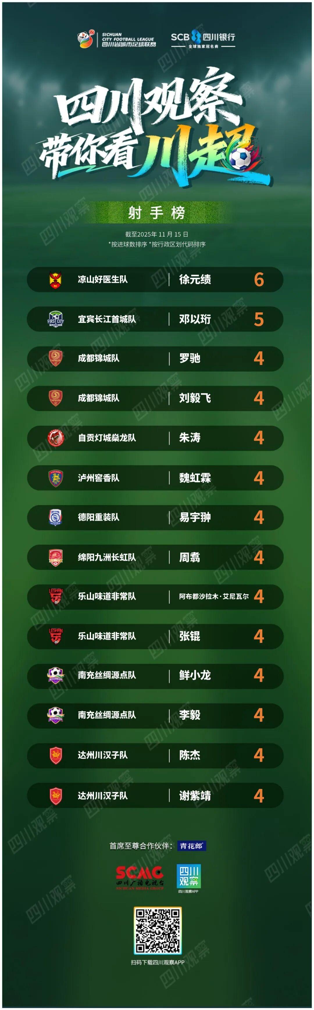 2025/2026赛季四川银行四川省城市足球联赛激战正酣,11月15日的最新战报已经火热出炉!本轮比赛各队表现精彩纷呈,积分榜和射手榜也迎来了新一轮的更新。