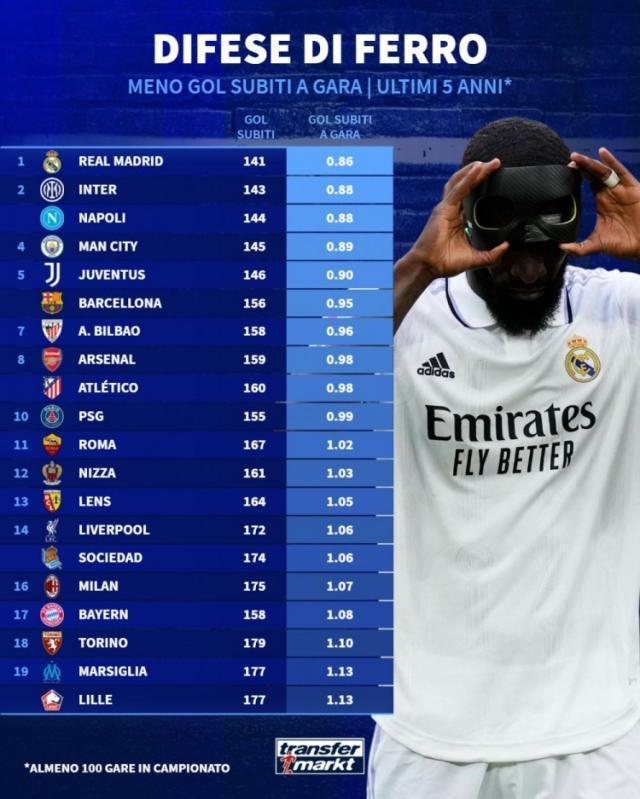 近5年五大联赛场均失球最少榜:皇马居首,国米、那不勒斯前三