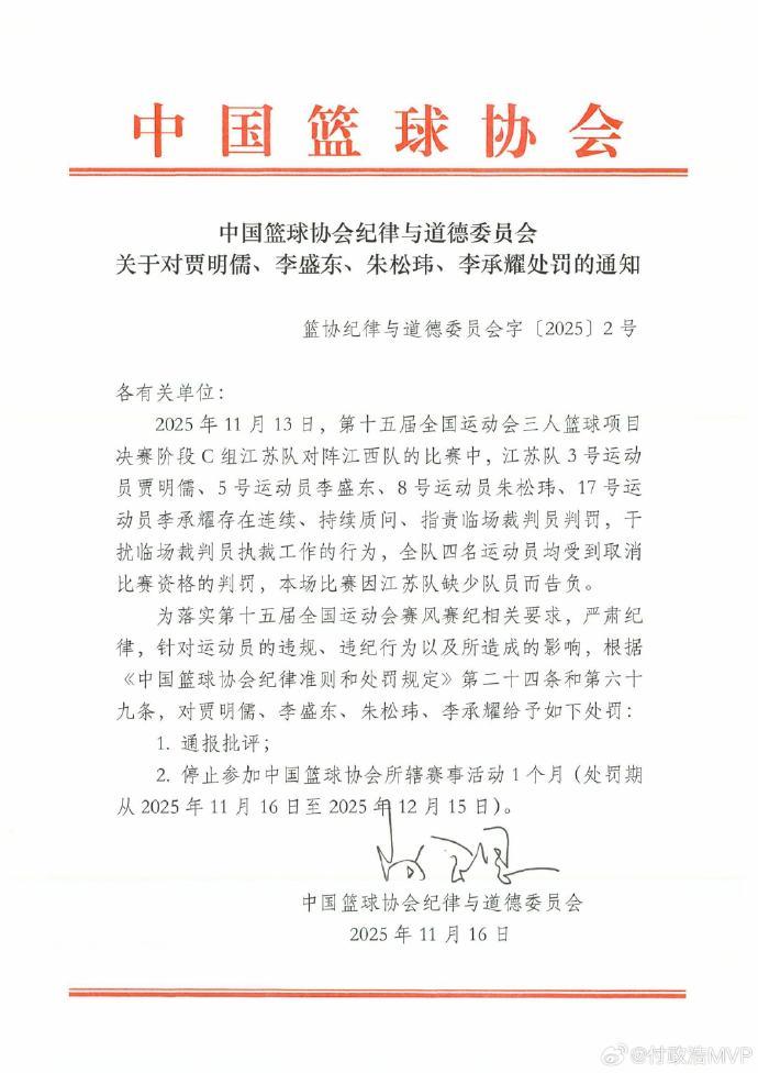 昨晚9时整,中国篮球协会通过官方渠道发布处罚公告:除对涉事四名球员进行通报批评外,更作出停止参加中国篮协所辖赛事活动1个月的严厉处罚(处罚期自2025年11月16日至12月15日)。这意味着四名球员不仅将缺席2026俱乐部杯12月份的全部赛事,更可能影响其所在俱乐部的联赛首轮备战计划,职业前景蒙上阴影。