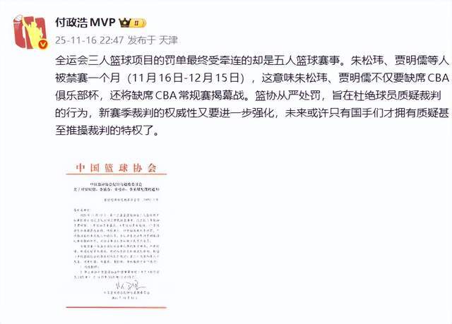 第十五届全运会尚未落幕,中国篮协却以一纸重磅罚单抢占体育头条。11月16日晚间,篮协正式公布处罚决定:参加全运会三人男篮比赛的江苏队四名球员朱松玮、贾明儒、李盛东和李承耀,因在比赛中质疑裁判被取消资格后,追加禁赛一个月(2025年11月16日至12月15日)。