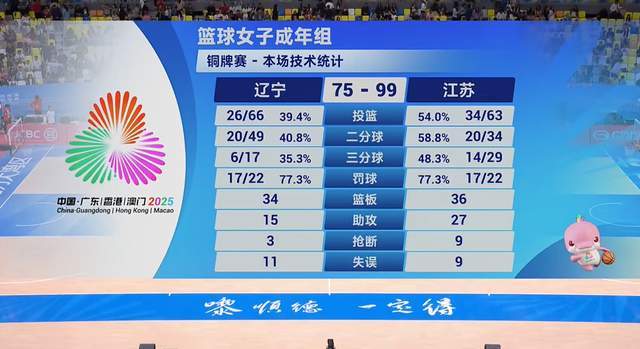 面对如此巨大的分差,辽宁队虽然奋力追赶,但终究无力回天。江苏队则继续以我为主,敢拼敢打,不给辽宁队任何翻盘的机会。最终,辽宁队以75-99不敌江苏队,获得了第四名,而江苏女篮则如愿以偿地拿到了铜牌。
