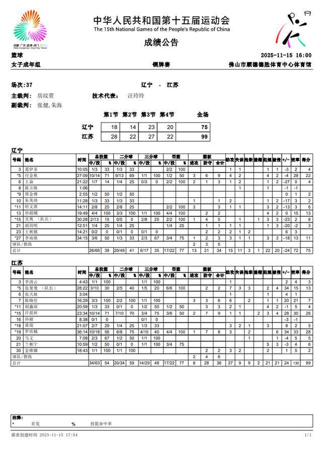 在球员数据方面,辽宁队的付金秋表现出色,贡献了22分9篮板4助攻的全面数据;李雨萌也有11分3篮板3助攻入账;孙超越则得到了13分2篮板。而江苏队方面,罗欣棫砍下了28分8篮板3助攻的豪华数据;许晨妍也有26分9篮板的出色表现;张曼曼则贡献了13分2篮板7助攻。