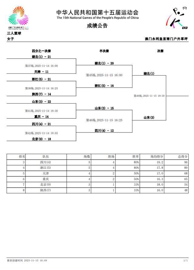 随着决赛队伍产生,本届全运会三人女篮最终排名也尘埃落定:山东队与湖北队会师决赛,四川队获得季军,浙江队位列第四,天津、重庆、北京和陕西分列五至八名。今晚19:30,山东队与湖北队将展开金牌争夺战,是山东队凭借内线优势登顶,还是湖北队延续黑马本色创造历史?让我们共同期待这场巅峰对决!