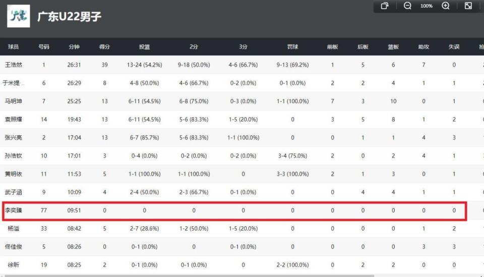 本场比赛广东U22男篮展现强大火力,四人得分上双:王浩然狂砍39分6篮板7助攻,马明坤贡献13分10篮板的两双数据,袁照耀与张兴亮也分别得到13分。反观广东宏远青训体系培养的几位球员则表现平平,徐昕仅得2分2篮板,杨溢和黄明依各得5分,而李奕臻的0数据表现尤为刺眼。