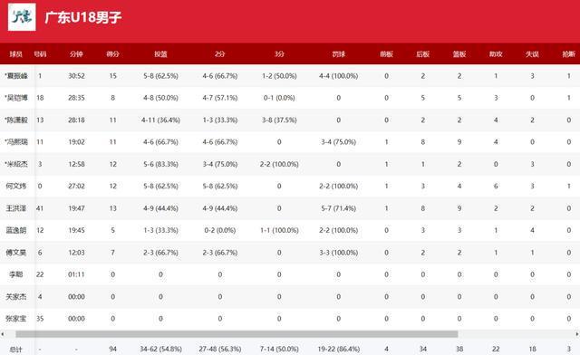 数据方面,广东队表现全面开花,共有6人得分上双。夏振峰贡献15分,王洪泽得到13分并抢下9个篮板,米绍杰拿下12分,何文炜则贡献12分、4个篮板和6次助攻,冯熙瑞得到11分、9个篮板和4次助攻,陈潇毅也有11分和4次助攻入账。