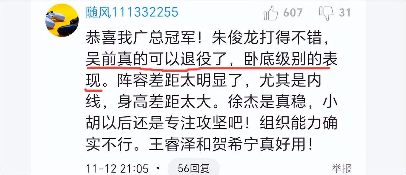 吴前的低迷表现并非仅限于决赛,多场比赛均表现不佳。半决赛对阵四川6中1,对阵上海7中2,小组赛对阵广东6中2,多场比赛得分寥寥无几,场均命中率仅二成,远未达到顶薪球员应有的水准。球迷纷纷评论:“吴前真的不行了,一上防守强度就投了个14中1,我怀疑他的年龄可能有造假,否则这个年龄不可能打不动了。”、“难怪吴前、原帅这种球员进不了国家队。”更有球迷直言:“吴前可以退役了。”笔者认为,吴前或许更适合担任助理教练的角色,而非继续兼任队员。对此,您有何看法?