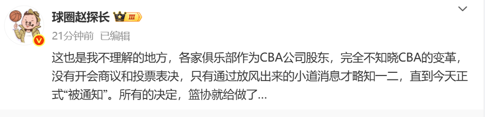 据知名篮球记者赵探长披露,作为CBA公司股东的各俱乐部代表,在潜力赛计划公布前完全不知情。该决策既未召开股东会议商议,也未进行投票表决,各队仅在计划正式实施时才收到"被动通知"。这种单方面决策模式,让联赛各参与方均感到震惊。