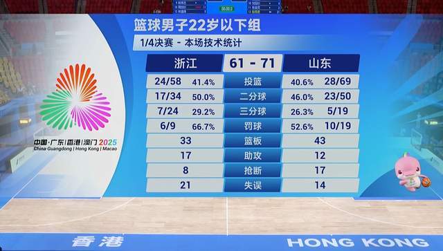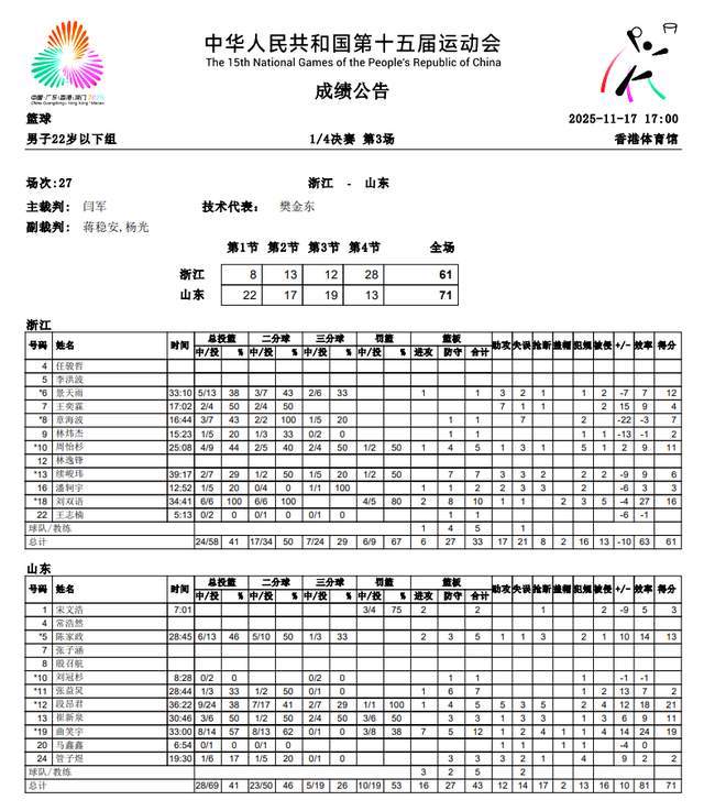 根据赛程安排,山东队半决赛将迎战北京与天津的胜者。从实力对比来看,北京队晋级概率较大,但无论对手是谁,山东队若想冲击金牌,必须解决末节松懈的老问题。技术统计显示,山东队全场命中率仅40.6%,低于浙江队的41.4%,能够取胜主要依靠38-28的篮板优势。核心球员方面,段昂君24投9中得到21分5篮板5助攻,曲笑宇贡献19分12篮板的两双数据,陈家政13投6中拿下13分5篮板,崔新泉则有11分3篮板进账。