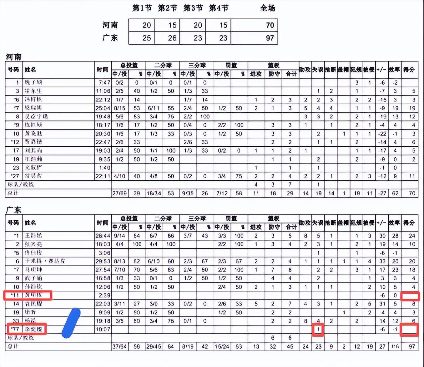 本场比赛,广东队有四人得分上双,其中王浩然砍下24分,于米提也有20分入账,来自深圳和广州的队员表现抢眼。然而,来自广东宏远的队员却表现平平,甚至可以用糟糕来形容。徐昕、黄明依和李奕臻等球员上场时间有限,仅打了几分钟,数据也惨不忍睹。除了杨溢拿到6分8助攻外,李奕臻和黄明依的表现更是让广东球迷大跌眼镜。