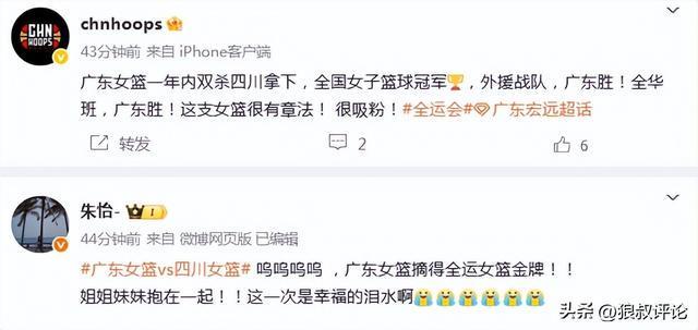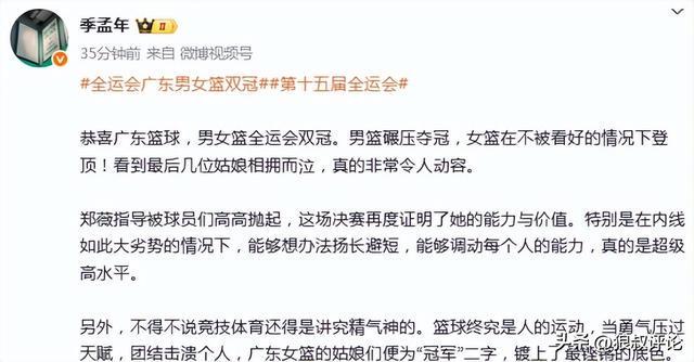 篮球记者季孟年在赛后发文点评:“恭喜广东篮球实现男女篮全运会双冠!男篮以碾压之势夺冠,女篮则在不被看好的情况下登顶。看到几位姑娘相拥而泣的场景,真的非常令人动容。”他特别提到,主教练郑薇被球员们高高抛起的画面,正是对其执教能力的最佳证明。
