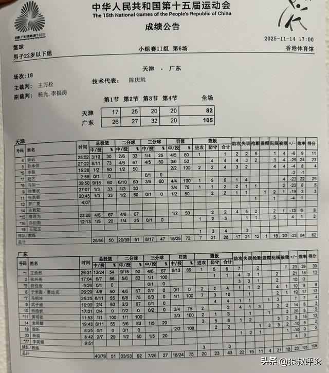 北京时间11月14日,在U22男篮小组赛的收官战中,广东U22男篮与天津U22男篮展开了一场激烈对决。经过四节鏖战,广东队凭借出色的整体发挥,以105:82的比分战胜对手,豪取小组赛三连胜,并以小组头名的身份强势晋级下一阶段。