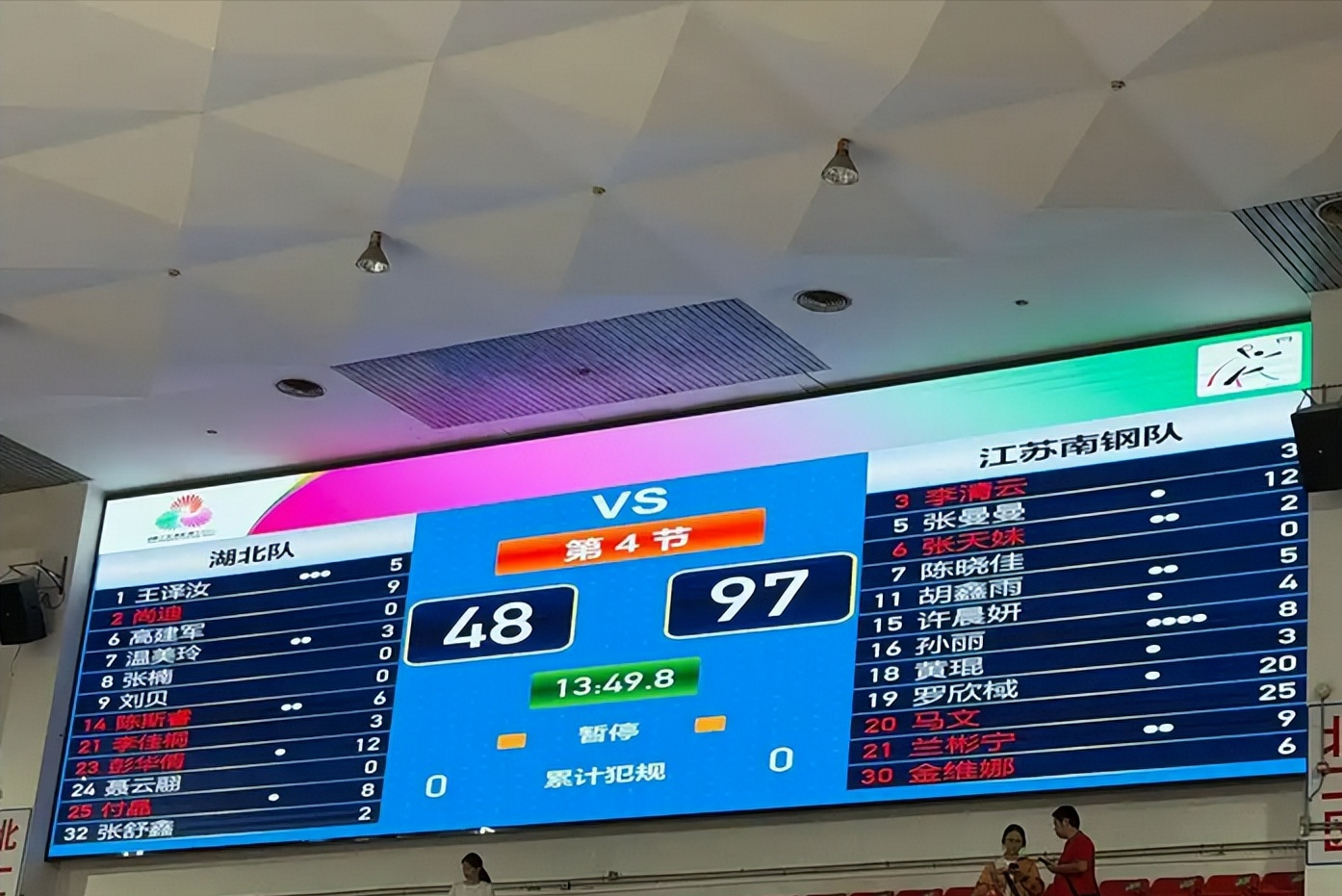 江苏队97比48大胜湖北队展现统治力。湖北队仅彭华倩得分上双(12分4篮板),付晶8分4篮板6助攻难支大局。江苏队国手罗欣棫17分钟高效砍下20分11篮板,马文25分6篮板统治内线,张曼曼12分2助攻串联进攻。38岁老将陈晓佳转型球员后6分钟贡献2篮板2助攻,球队多点开花晋级四强。