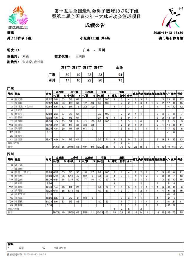 在十五运男子篮球U18组别赛事中,广东队以94-75的绝对优势战胜四川队,不仅斩获两连胜,更提前锁定八强席位。本场比赛夏振峰爆发砍下15分,王洪泽贡献12分9篮板,全队6人得分上双的全面表现成为制胜关键。