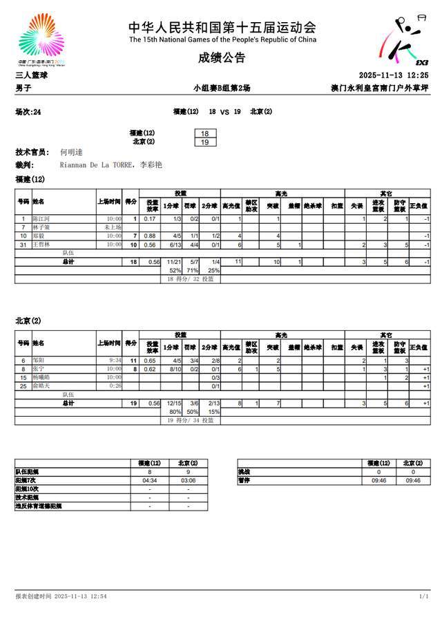 北京队此役呈现明显双核态势:张宁11投8中高效砍下8分4篮板,邹阳13投6中贡献11分4篮板,两人包办全队19分中的19分。福建队则更多依赖王哲林的内线统治力,其14投6中加4罚4中拿下10分8篮板,郑毅7投5中贡献7分,但陈江河4投1中且关键罚球失准,最终遗憾落败。