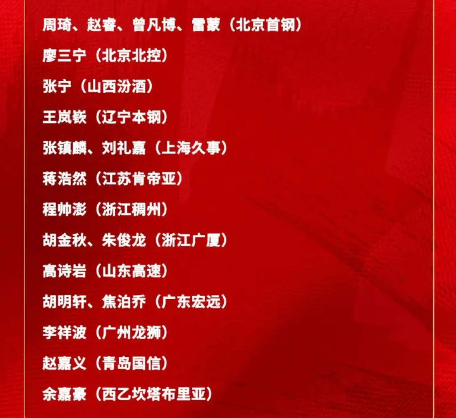 张宁、王岚嵚、刘礼嘉、蒋浩然、程帅澎、周琦、曾凡博、胡金秋、朱俊龙、高诗岩、赵睿、雷蒙、廖三宁、张镇麟、胡明轩、赵嘉义、焦泊乔、李祥波、余嘉豪