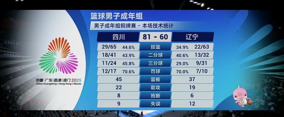 值得注意的是,周琦此前两届全运会均代表辽宁队出战并夺冠,今年转投四川队后仅获季军,这一选择引发讨论。辽宁队方面,赵继伟在半决赛中左大腿肌肉拉伤缺席三四名决赛,老将韩德君替补出战25分钟,得到5分17篮板后笑着离场,付豪13分5篮板1助攻,高诗岩12分2篮板7助攻4抢断,俞泽辰14分2篮板1抢断1盖帽。
